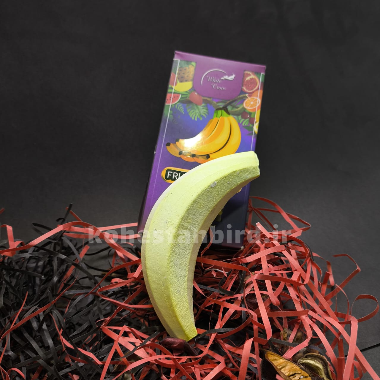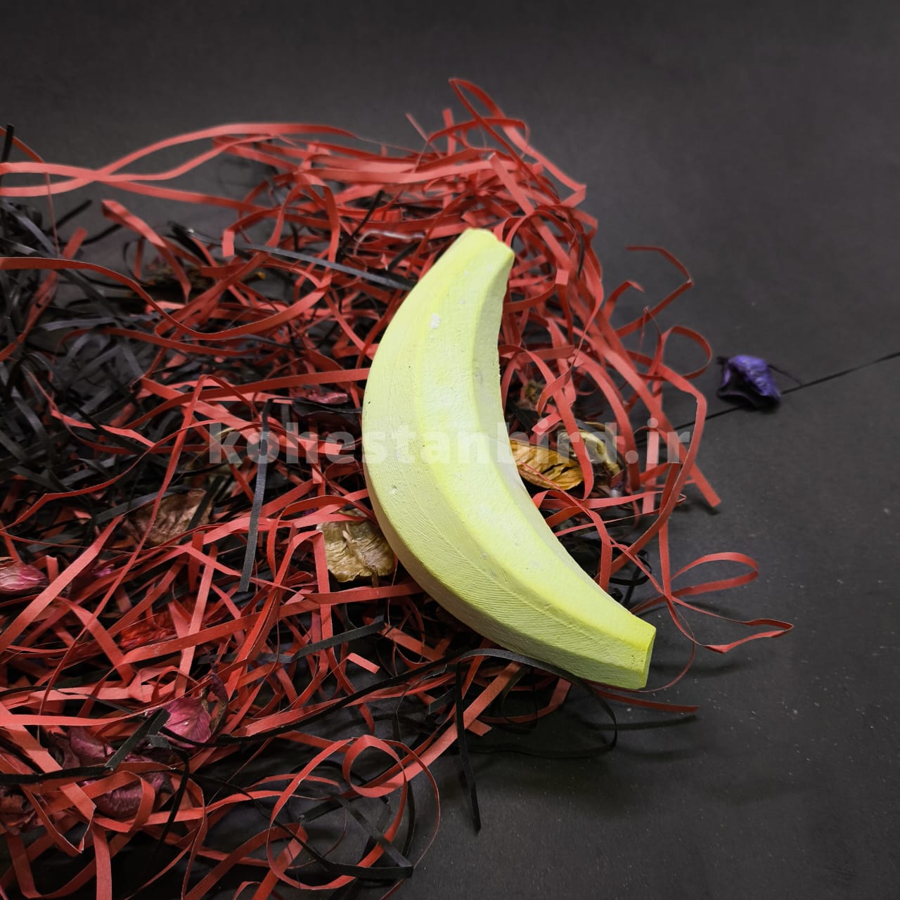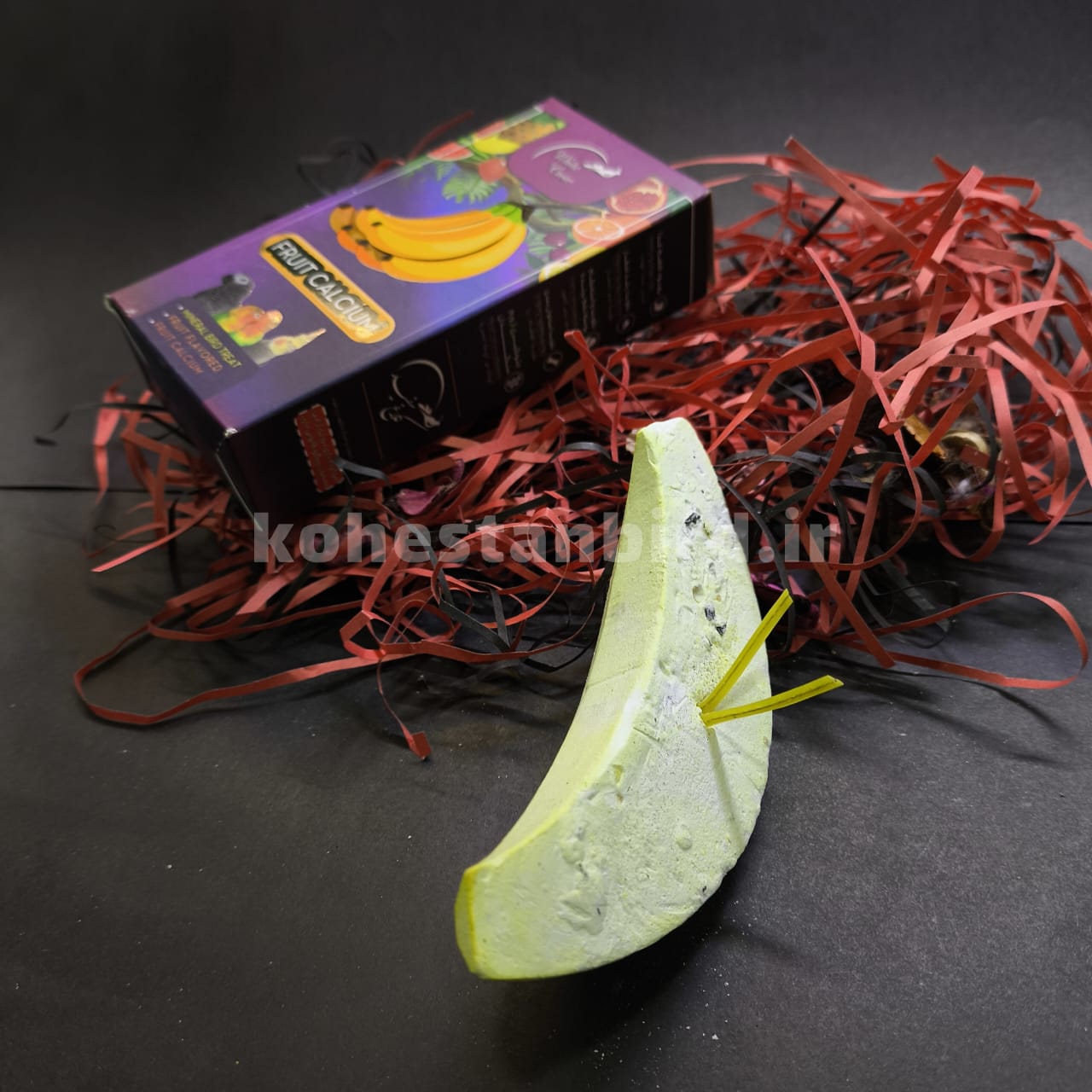 سنگ کلسیم موزی با طراحی فانتزی به شکل موز و رنگ زرد جذاب، علاوه بر زیبایی، یه منبع عالی از کلسیم برای پرندههاست.
